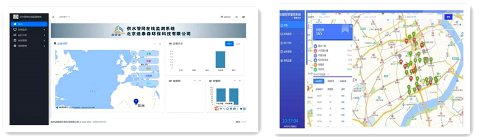 智能漏水系統(tǒng)由系統(tǒng)總覽、在線監(jiān)控、漏水分析、業(yè)務(wù)管理、工單處理等模塊組成。1)系統(tǒng)總覽:地圖上展示紅、黃、綠漏水噪音狀態(tài)