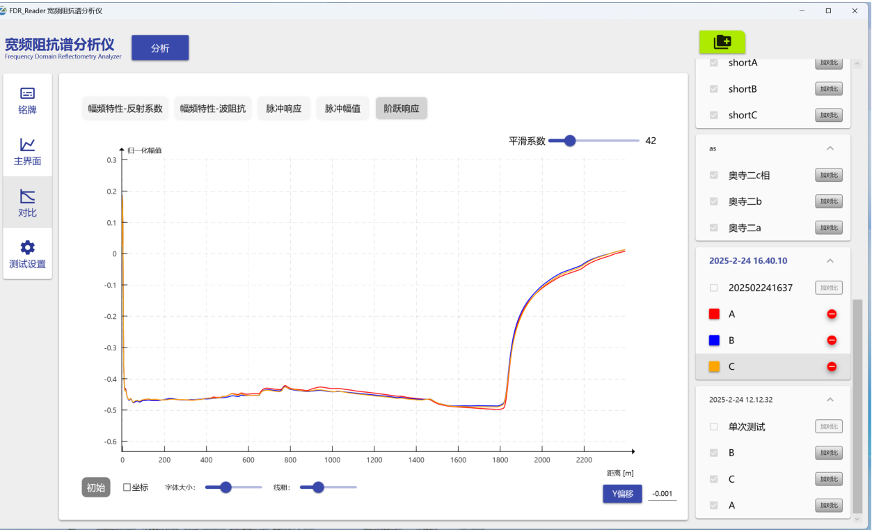 通過對A、B、C三相階躍響應結果對比分析發(fā)現(xiàn),在879.04米處,三相的波阻抗歸一化幅值出現(xiàn)了明顯的分層階躍后大幅下降,該位置導致三相絕緣降低; 同時在650.25米處也出現(xiàn)了三相的階躍增幅,疑似該處發(fā)生了進水,建議條件允許的情況下進行檢查維護。